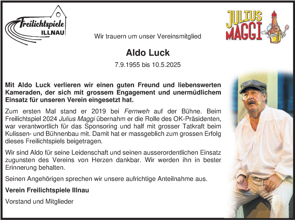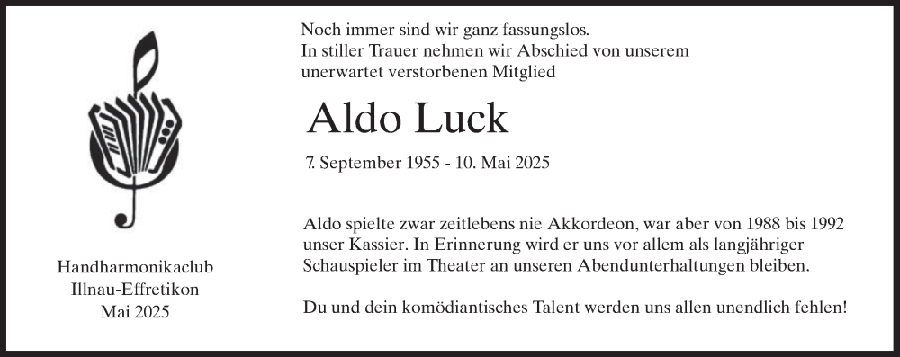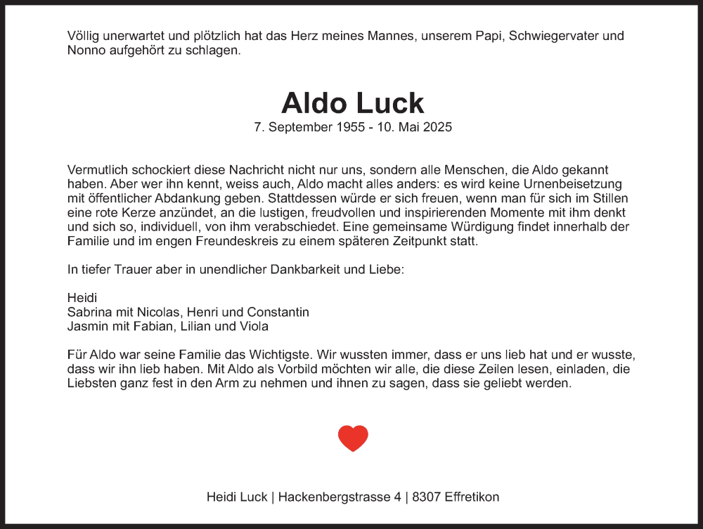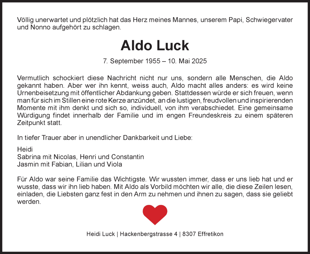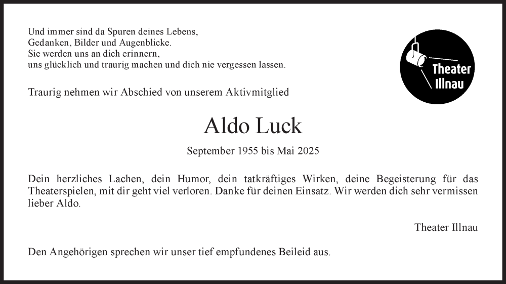 Hier finden Sie alle Traueranzeigen aus der Zeitung, die bisher für Aldo Luck erschienen sind. Weitere Traueranzeigen, die in der Zeitung erscheinen, werden hier ebenfalls aufgelistet