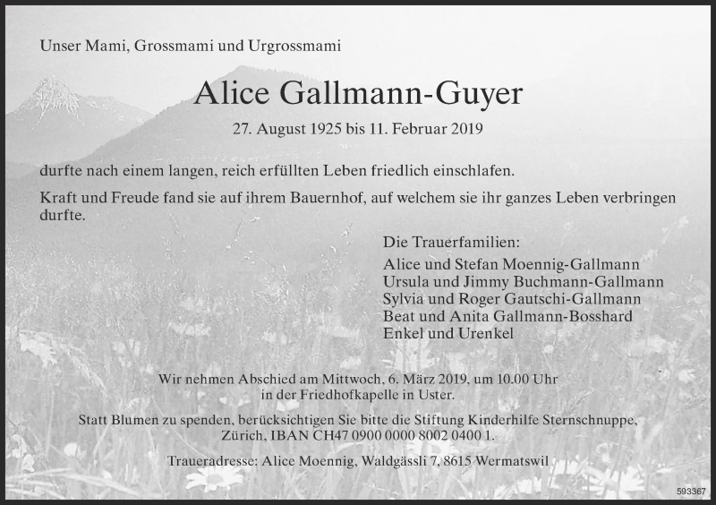 Hier finden Sie alle Traueranzeigen aus der Zeitung, die bisher für Alice Gallmann-Guyer erschienen sind. Weitere Traueranzeigen, die in der Zeitung erscheinen, werden hier ebenfalls aufgelistet
