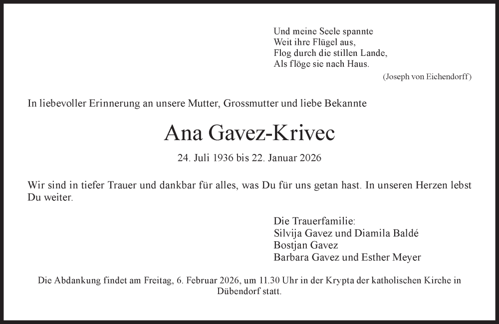 Hier finden Sie alle Traueranzeigen aus der Zeitung, die bisher für Ana Gavez-Krivec erschienen sind. Weitere Traueranzeigen, die in der Zeitung erscheinen, werden hier ebenfalls aufgelistet