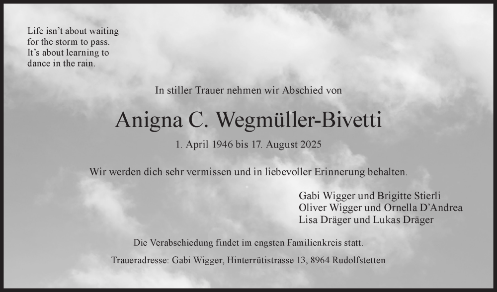 Hier finden Sie alle Traueranzeigen aus der Zeitung, die bisher für Anigna C. Wegmüller-Bivetti erschienen sind. Weitere Traueranzeigen, die in der Zeitung erscheinen, werden hier ebenfalls aufgelistet