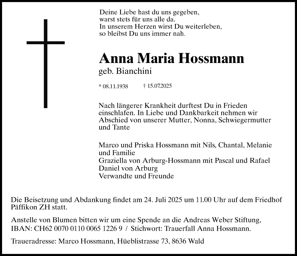 Hier finden Sie alle Traueranzeigen aus der Zeitung, die bisher für Anna Maria Hossmann erschienen sind. Weitere Traueranzeigen, die in der Zeitung erscheinen, werden hier ebenfalls aufgelistet