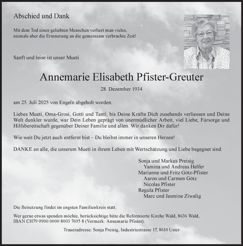 Hier finden Sie alle Traueranzeigen aus der Zeitung, die bisher für Annemarie Elisabeth Pfister erschienen sind. Weitere Traueranzeigen, die in der Zeitung erscheinen, werden hier ebenfalls aufgelistet