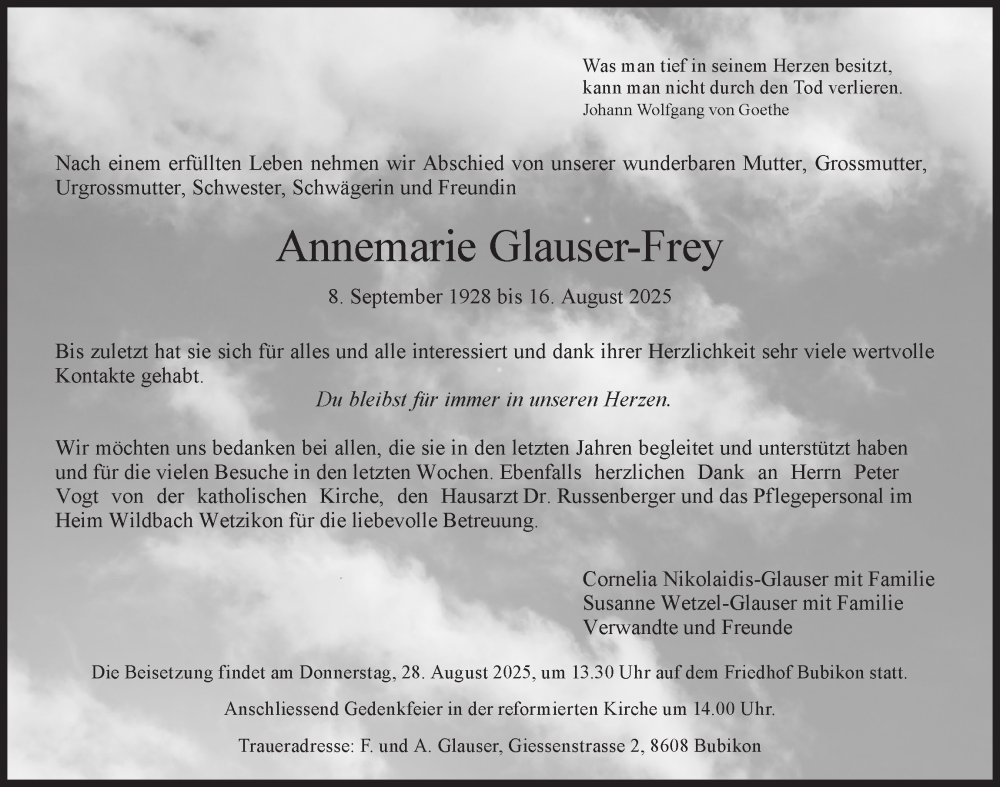 Hier finden Sie alle Traueranzeigen aus der Zeitung, die bisher für Annemarie Glauser-Frey erschienen sind. Weitere Traueranzeigen, die in der Zeitung erscheinen, werden hier ebenfalls aufgelistet