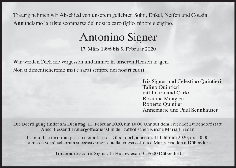 Hier finden Sie alle Traueranzeigen aus der Zeitung, die bisher für Antonino Signer erschienen sind. Weitere Traueranzeigen, die in der Zeitung erscheinen, werden hier ebenfalls aufgelistet