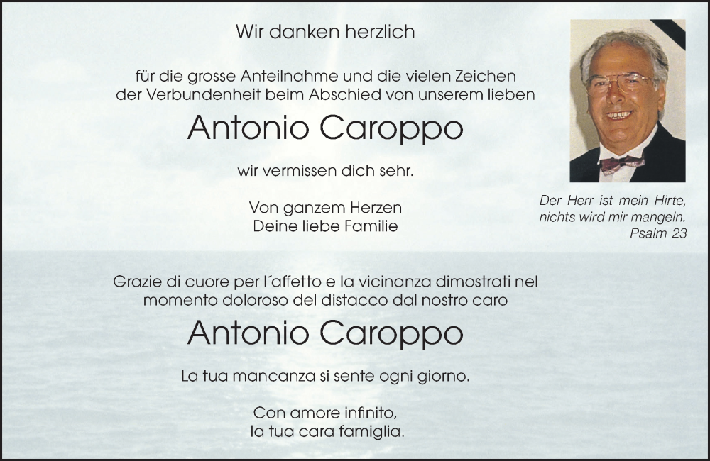 Hier finden Sie alle Traueranzeigen aus der Zeitung, die bisher für Antonio Caroppo erschienen sind. Weitere Traueranzeigen, die in der Zeitung erscheinen, werden hier ebenfalls aufgelistet