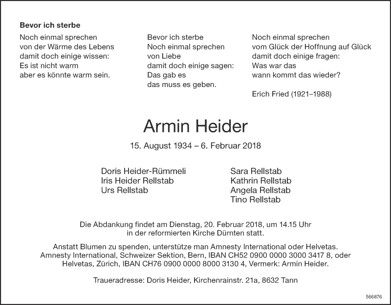 Hier finden Sie alle Traueranzeigen aus der Zeitung, die bisher für Armin Heider erschienen sind. Weitere Traueranzeigen, die in der Zeitung erscheinen, werden hier ebenfalls aufgelistet