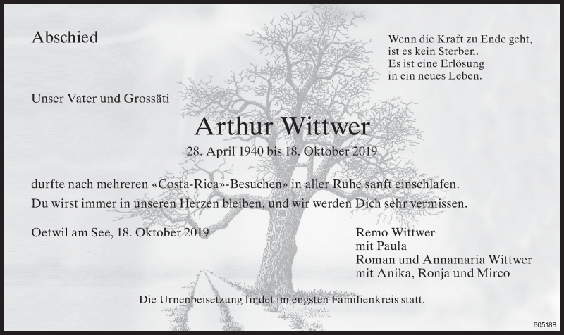 Hier finden Sie alle Traueranzeigen aus der Zeitung, die bisher für Arthur Wittwer erschienen sind. Weitere Traueranzeigen, die in der Zeitung erscheinen, werden hier ebenfalls aufgelistet
