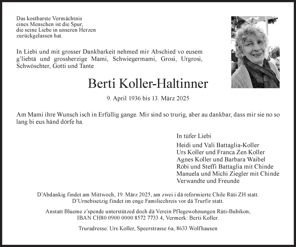 Hier finden Sie alle Traueranzeigen aus der Zeitung, die bisher für Berti Koller-Haltinner erschienen sind. Weitere Traueranzeigen, die in der Zeitung erscheinen, werden hier ebenfalls aufgelistet