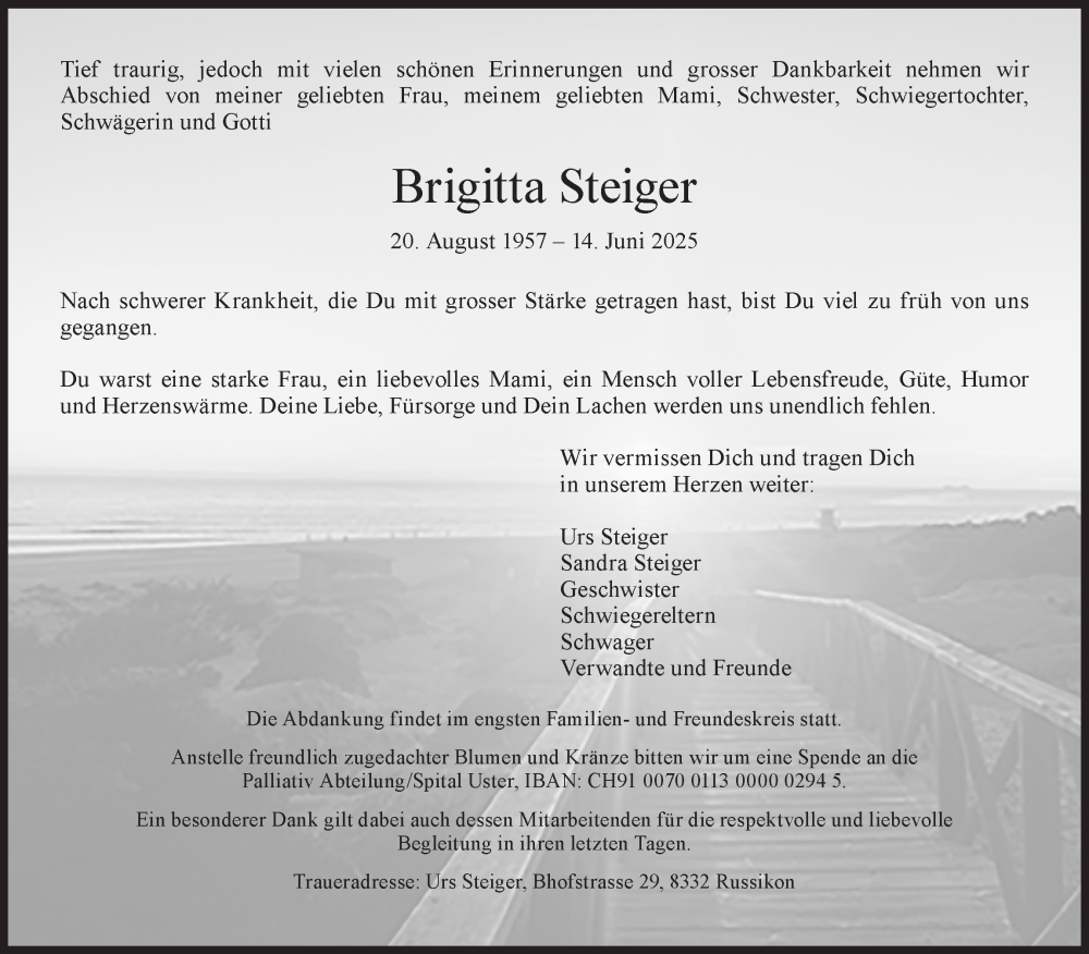 Hier finden Sie alle Traueranzeigen aus der Zeitung, die bisher für Brigitta Steiger erschienen sind. Weitere Traueranzeigen, die in der Zeitung erscheinen, werden hier ebenfalls aufgelistet