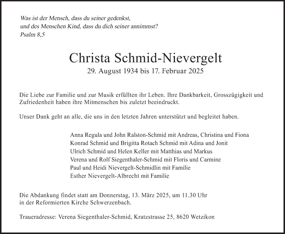 Hier finden Sie alle Traueranzeigen aus der Zeitung, die bisher für Christa Schmid-Nievergelt erschienen sind. Weitere Traueranzeigen, die in der Zeitung erscheinen, werden hier ebenfalls aufgelistet