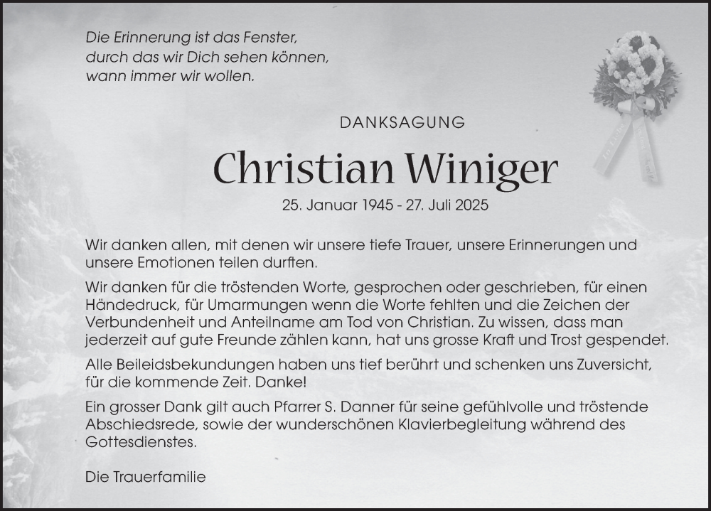 Hier finden Sie alle Traueranzeigen aus der Zeitung, die bisher für Christian Winiger erschienen sind. Weitere Traueranzeigen, die in der Zeitung erscheinen, werden hier ebenfalls aufgelistet
