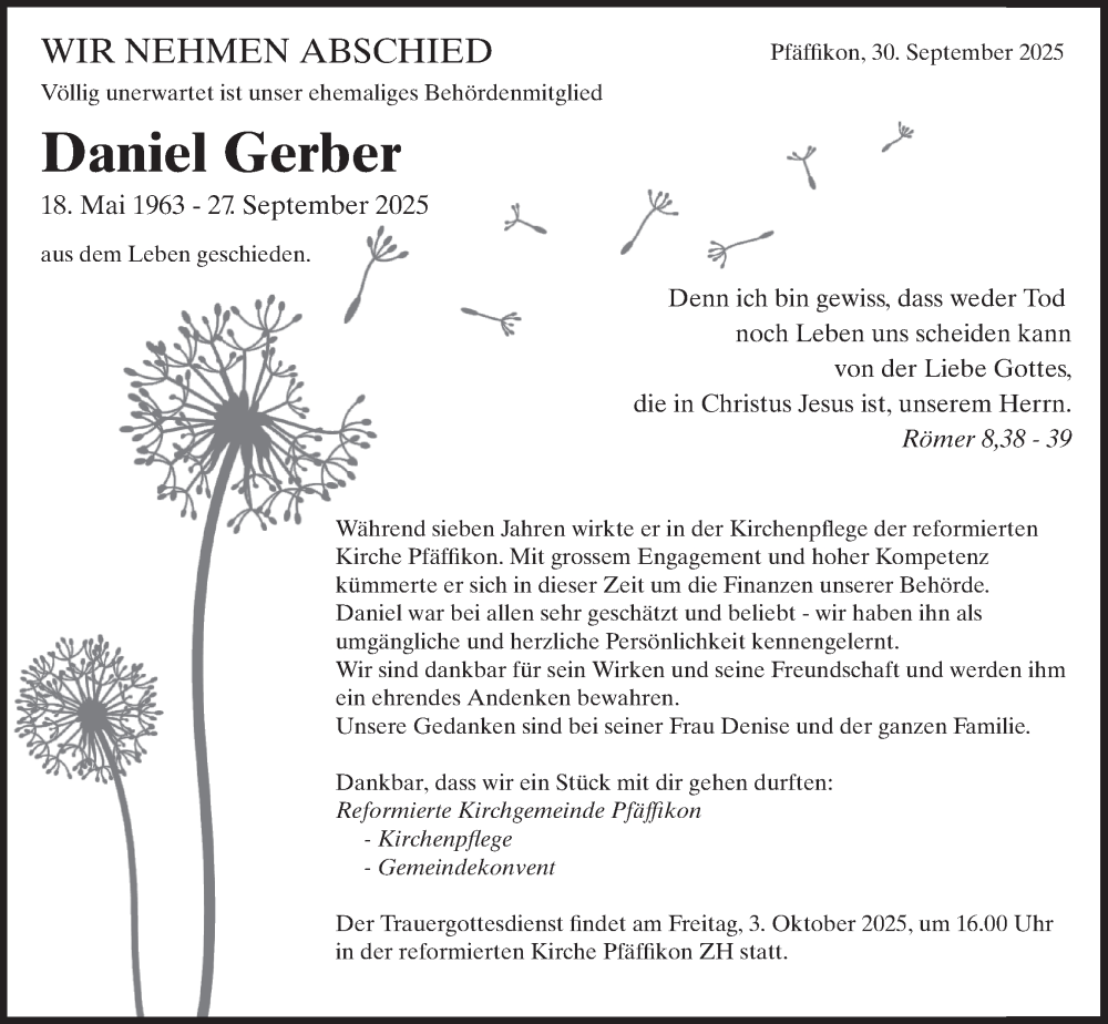 Hier finden Sie alle Traueranzeigen aus der Zeitung, die bisher für Daniel Gerber erschienen sind. Weitere Traueranzeigen, die in der Zeitung erscheinen, werden hier ebenfalls aufgelistet