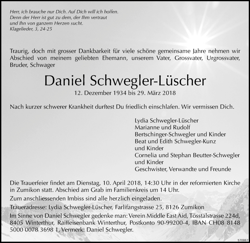 Hier finden Sie alle Traueranzeigen aus der Zeitung, die bisher für Daniel Schwegler-Löscher erschienen sind. Weitere Traueranzeigen, die in der Zeitung erscheinen, werden hier ebenfalls aufgelistet