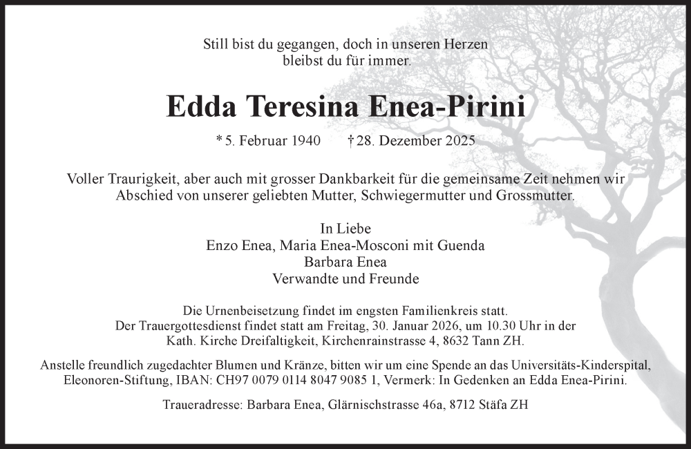 Hier finden Sie alle Traueranzeigen aus der Zeitung, die bisher für Edda Teresina Enea-Pirini erschienen sind. Weitere Traueranzeigen, die in der Zeitung erscheinen, werden hier ebenfalls aufgelistet