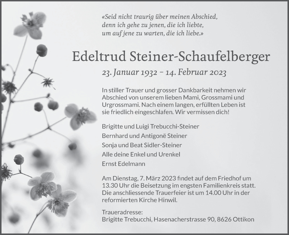 Hier finden Sie alle Traueranzeigen aus der Zeitung, die bisher für Edeltrud Steiner-Schaufelberger erschienen sind. Weitere Traueranzeigen, die in der Zeitung erscheinen, werden hier ebenfalls aufgelistet