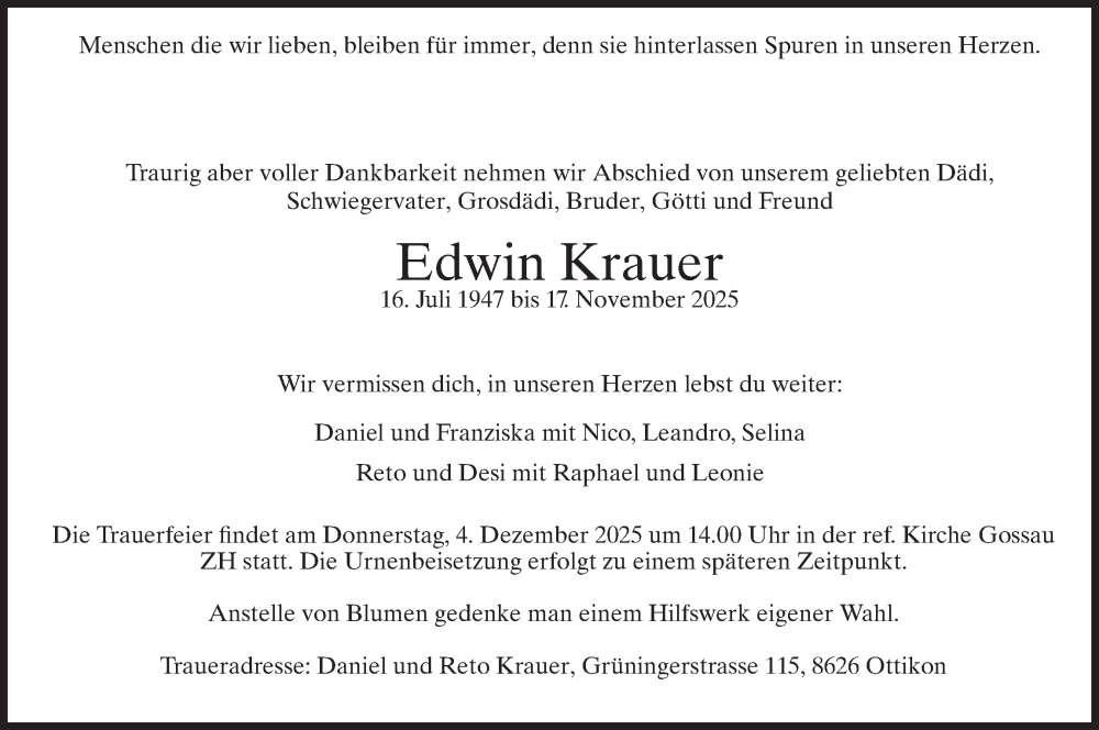 Hier finden Sie alle Traueranzeigen aus der Zeitung, die bisher für Edwin Krauer erschienen sind. Weitere Traueranzeigen, die in der Zeitung erscheinen, werden hier ebenfalls aufgelistet