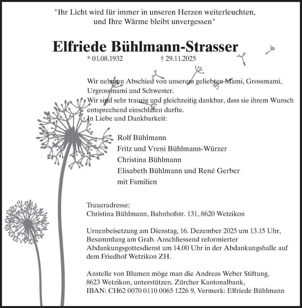 Hier finden Sie alle Traueranzeigen aus der Zeitung, die bisher für Elfriede Bühlmann-Strasser erschienen sind. Weitere Traueranzeigen, die in der Zeitung erscheinen, werden hier ebenfalls aufgelistet