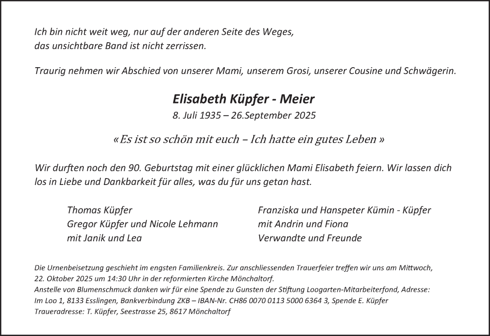 Hier finden Sie alle Traueranzeigen aus der Zeitung, die bisher für Elisabeth Küpfer-Meier erschienen sind. Weitere Traueranzeigen, die in der Zeitung erscheinen, werden hier ebenfalls aufgelistet