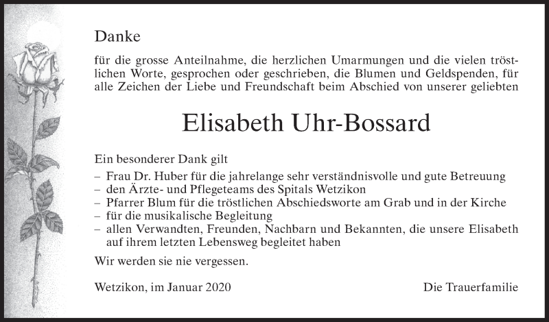 Hier finden Sie alle Traueranzeigen aus der Zeitung, die bisher für Elisabeth Uhr-Bossard erschienen sind. Weitere Traueranzeigen, die in der Zeitung erscheinen, werden hier ebenfalls aufgelistet