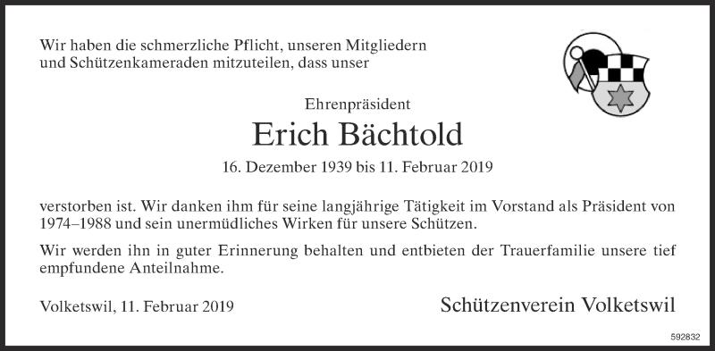 Hier finden Sie alle Traueranzeigen aus der Zeitung, die bisher für Erich Bächtold erschienen sind. Weitere Traueranzeigen, die in der Zeitung erscheinen, werden hier ebenfalls aufgelistet