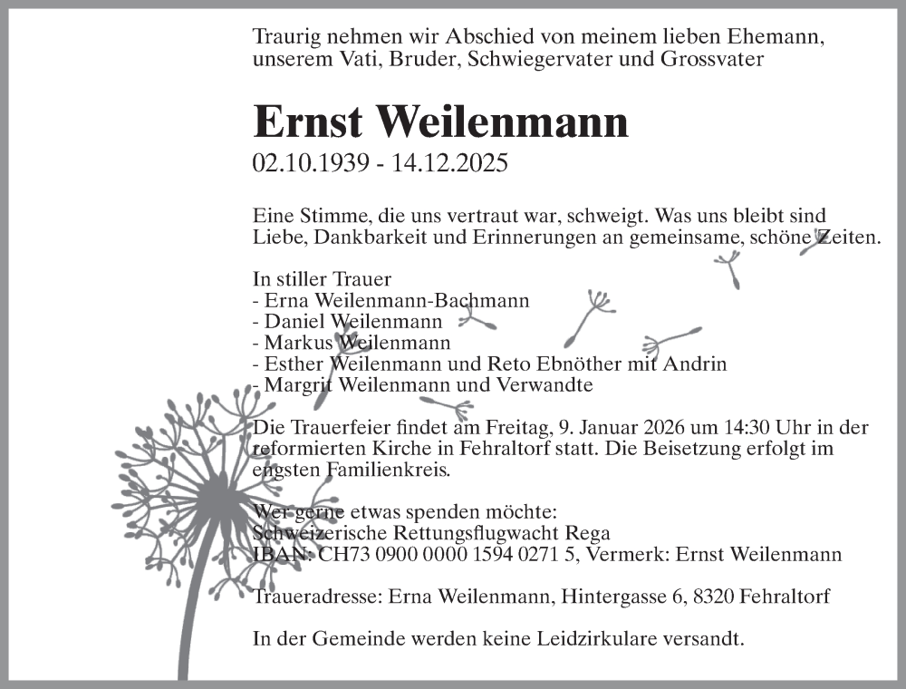 Hier finden Sie alle Traueranzeigen aus der Zeitung, die bisher für Ernst Weilenmann erschienen sind. Weitere Traueranzeigen, die in der Zeitung erscheinen, werden hier ebenfalls aufgelistet
