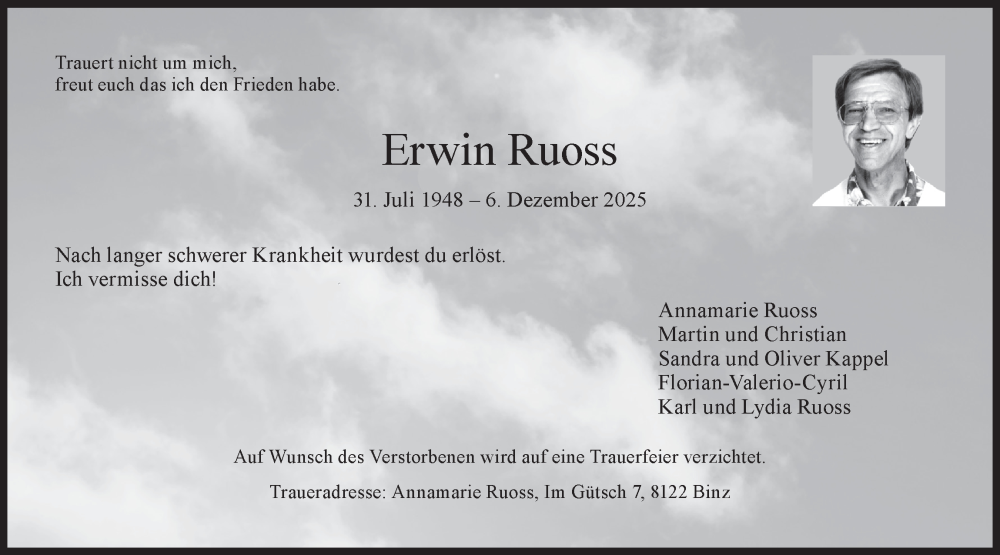Hier finden Sie alle Traueranzeigen aus der Zeitung, die bisher für Erwin Ruoss erschienen sind. Weitere Traueranzeigen, die in der Zeitung erscheinen, werden hier ebenfalls aufgelistet