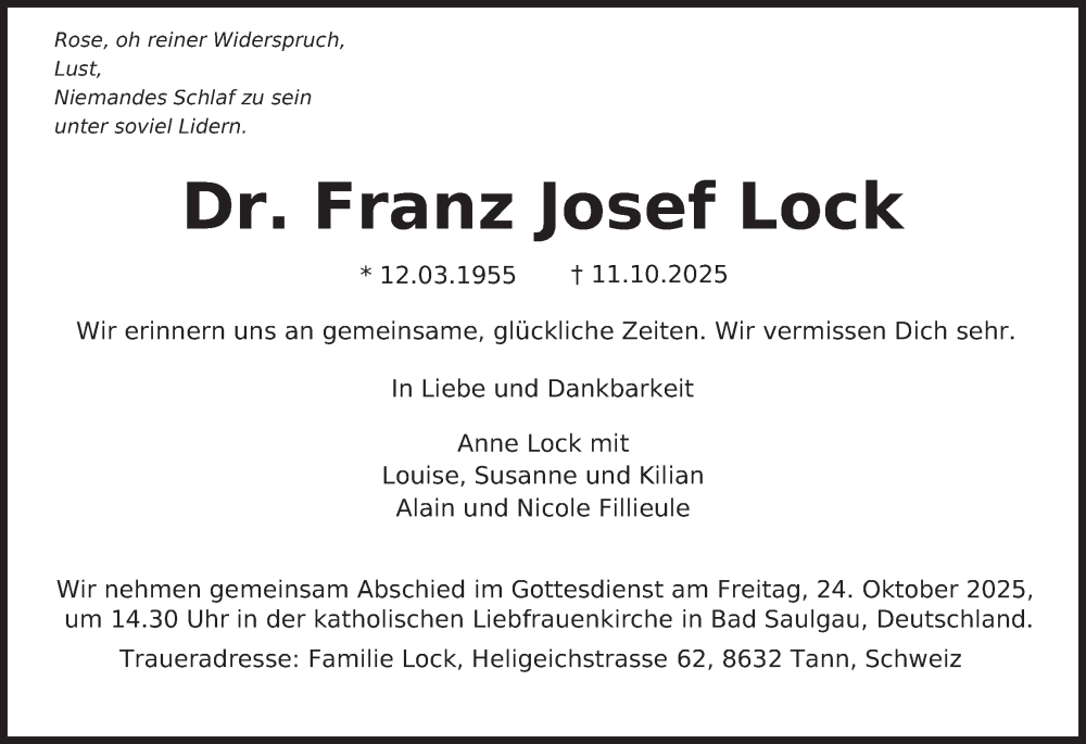 Hier finden Sie alle Traueranzeigen aus der Zeitung, die bisher für Franz Josef Lock erschienen sind. Weitere Traueranzeigen, die in der Zeitung erscheinen, werden hier ebenfalls aufgelistet