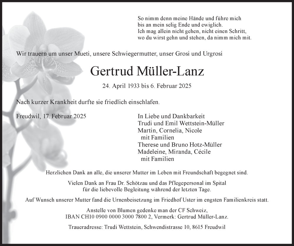 Hier finden Sie alle Traueranzeigen aus der Zeitung, die bisher für Gertrud Müller erschienen sind. Weitere Traueranzeigen, die in der Zeitung erscheinen, werden hier ebenfalls aufgelistet