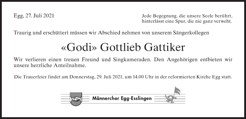 Hier finden Sie alle Traueranzeigen aus der Zeitung, die bisher für Gottlieb Gattiker erschienen sind. Weitere Traueranzeigen, die in der Zeitung erscheinen, werden hier ebenfalls aufgelistet