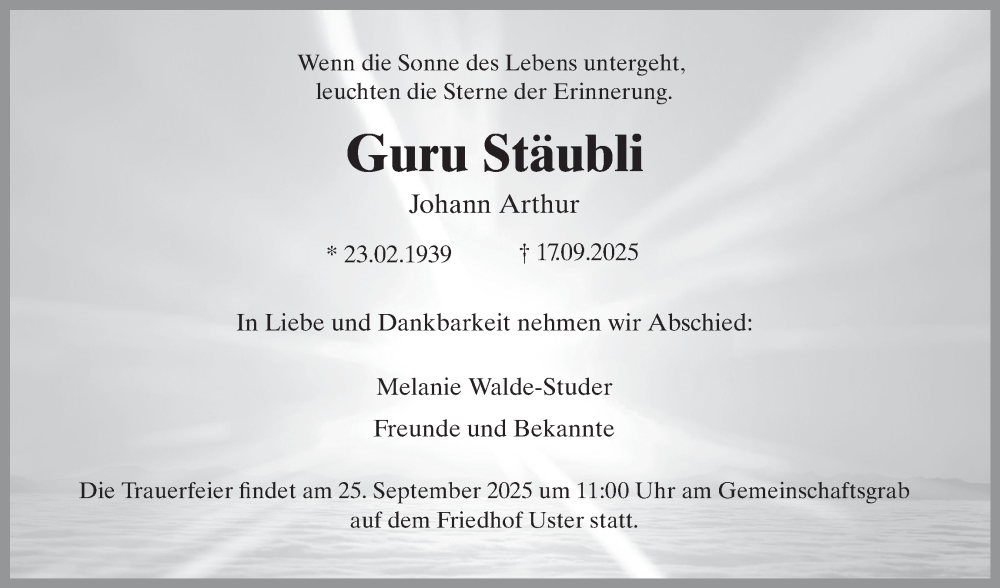 Hier finden Sie alle Traueranzeigen aus der Zeitung, die bisher für Guru Stäubli erschienen sind. Weitere Traueranzeigen, die in der Zeitung erscheinen, werden hier ebenfalls aufgelistet
