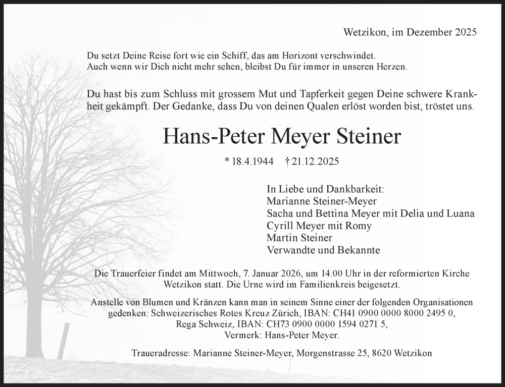 Hier finden Sie alle Traueranzeigen aus der Zeitung, die bisher für Hans-Peter Meyer Steiner erschienen sind. Weitere Traueranzeigen, die in der Zeitung erscheinen, werden hier ebenfalls aufgelistet