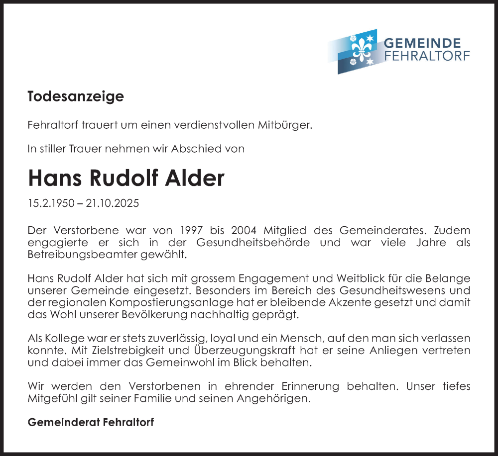 Hier finden Sie alle Traueranzeigen aus der Zeitung, die bisher für Hans Rudolf Alder erschienen sind. Weitere Traueranzeigen, die in der Zeitung erscheinen, werden hier ebenfalls aufgelistet
