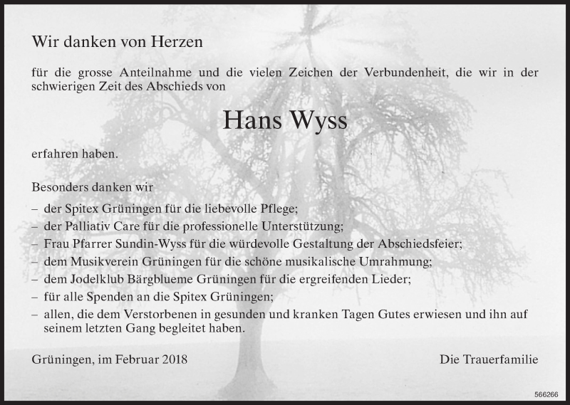 Hier finden Sie alle Traueranzeigen aus der Zeitung, die bisher für Hans Wyss erschienen sind. Weitere Traueranzeigen, die in der Zeitung erscheinen, werden hier ebenfalls aufgelistet