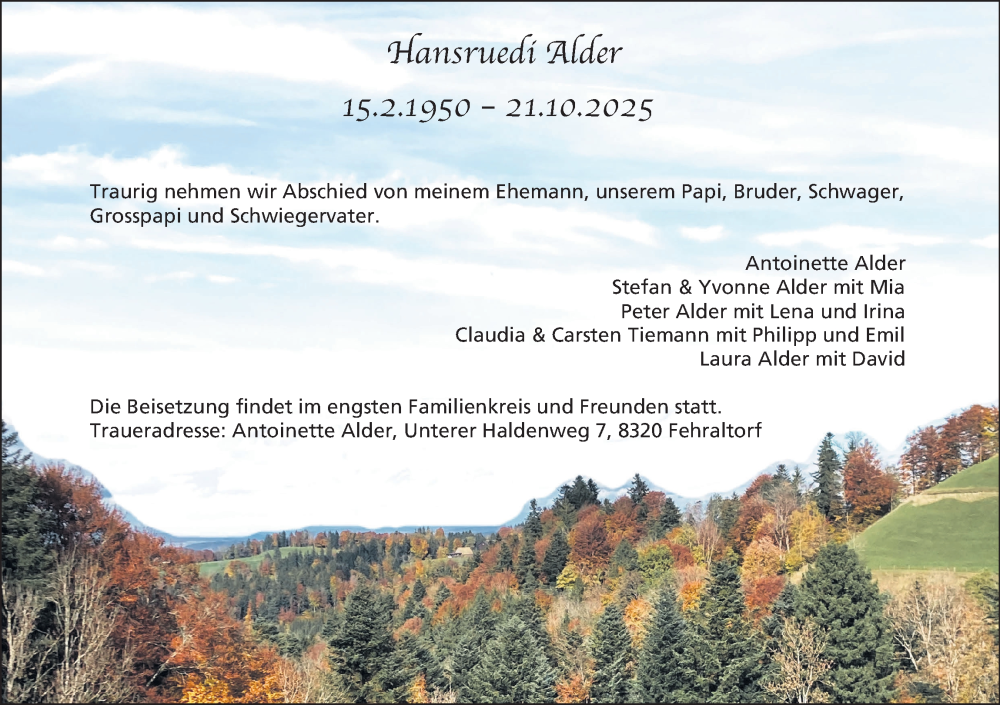 Hier finden Sie alle Traueranzeigen aus der Zeitung, die bisher für Hansruedi Alder erschienen sind. Weitere Traueranzeigen, die in der Zeitung erscheinen, werden hier ebenfalls aufgelistet