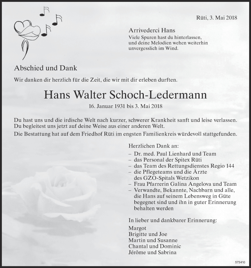 Hier finden Sie alle Traueranzeigen aus der Zeitung, die bisher für Hans Walter Schoch-Ledermann erschienen sind. Weitere Traueranzeigen, die in der Zeitung erscheinen, werden hier ebenfalls aufgelistet