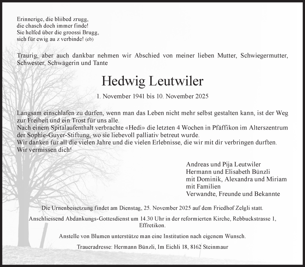 Hier finden Sie alle Traueranzeigen aus der Zeitung, die bisher für Hedwig Leutwiler erschienen sind. Weitere Traueranzeigen, die in der Zeitung erscheinen, werden hier ebenfalls aufgelistet