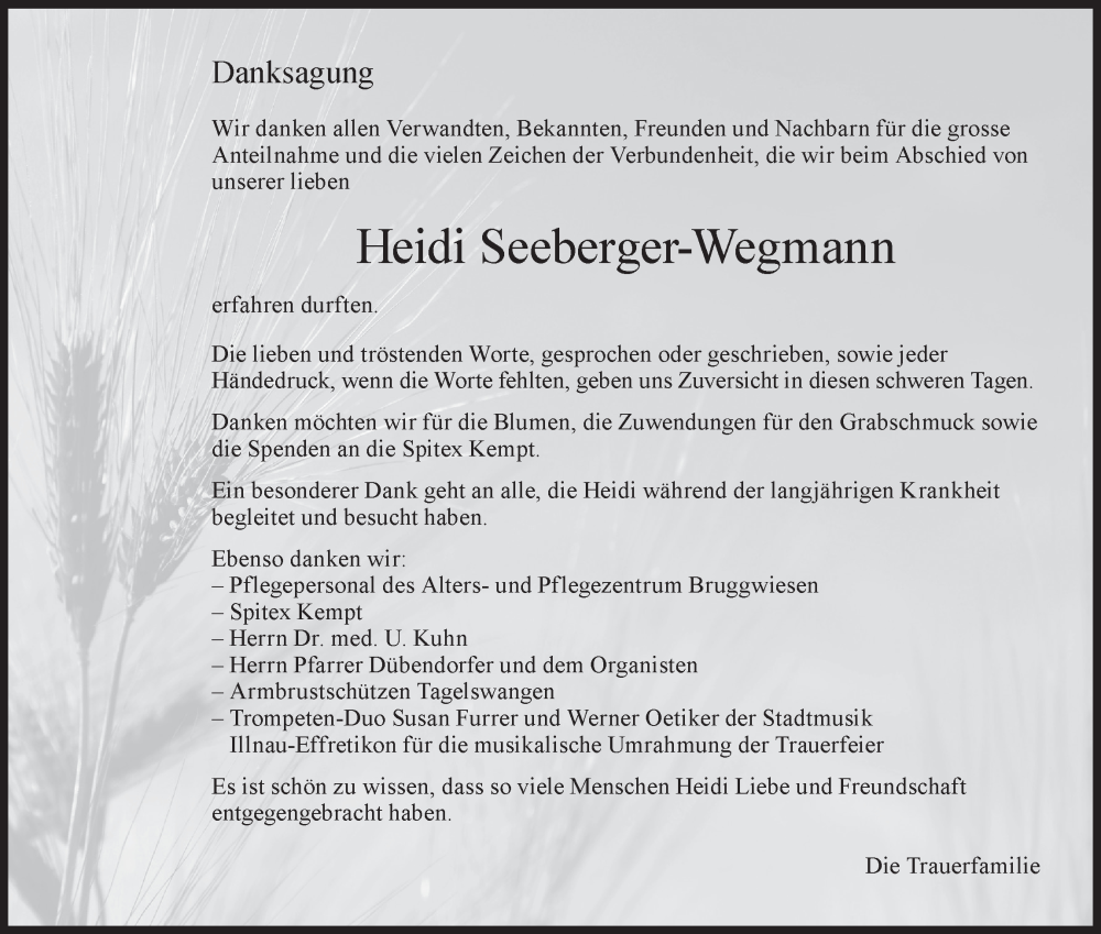 Hier finden Sie alle Traueranzeigen aus der Zeitung, die bisher für Heidi Seeberger-Wegmann erschienen sind. Weitere Traueranzeigen, die in der Zeitung erscheinen, werden hier ebenfalls aufgelistet