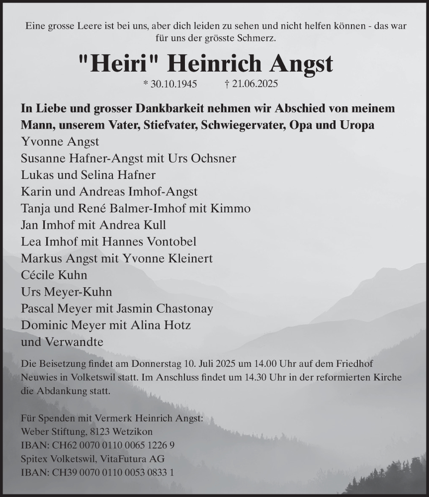 Hier finden Sie alle Traueranzeigen aus der Zeitung, die bisher für Heinrich Angst erschienen sind. Weitere Traueranzeigen, die in der Zeitung erscheinen, werden hier ebenfalls aufgelistet