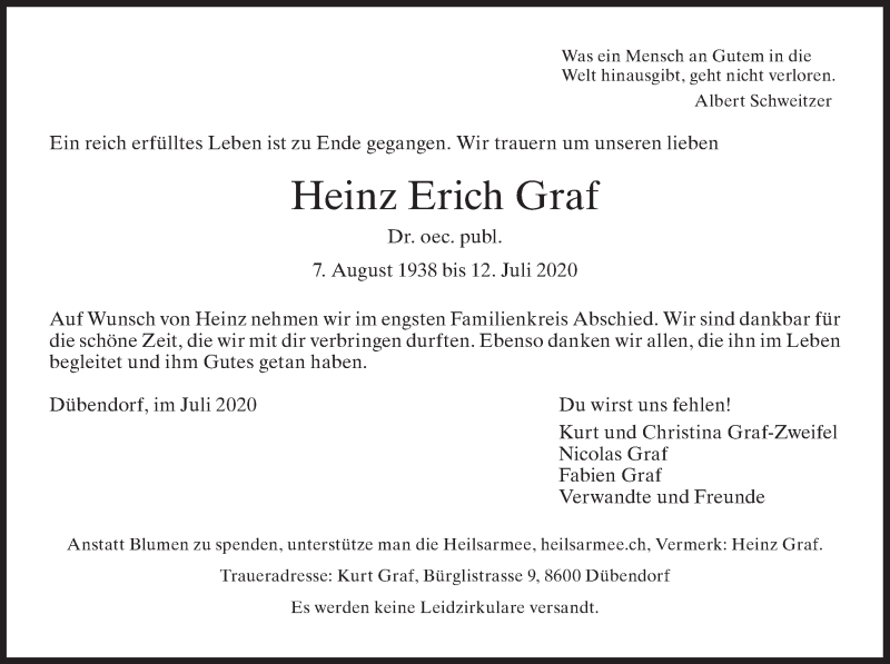 Hier finden Sie alle Traueranzeigen aus der Zeitung, die bisher für Heinz Erich Graf erschienen sind. Weitere Traueranzeigen, die in der Zeitung erscheinen, werden hier ebenfalls aufgelistet