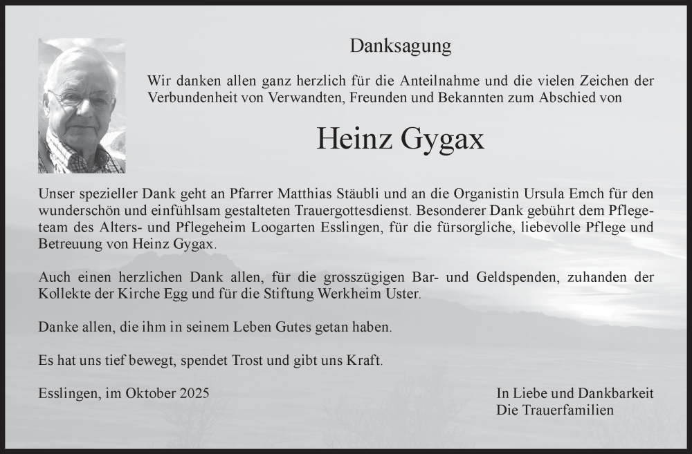 Hier finden Sie alle Traueranzeigen aus der Zeitung, die bisher für Heinz Gygax erschienen sind. Weitere Traueranzeigen, die in der Zeitung erscheinen, werden hier ebenfalls aufgelistet