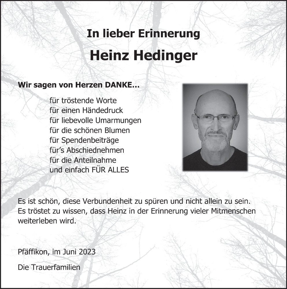 Hier finden Sie alle Traueranzeigen aus der Zeitung, die bisher für Heinz Hedinger erschienen sind. Weitere Traueranzeigen, die in der Zeitung erscheinen, werden hier ebenfalls aufgelistet