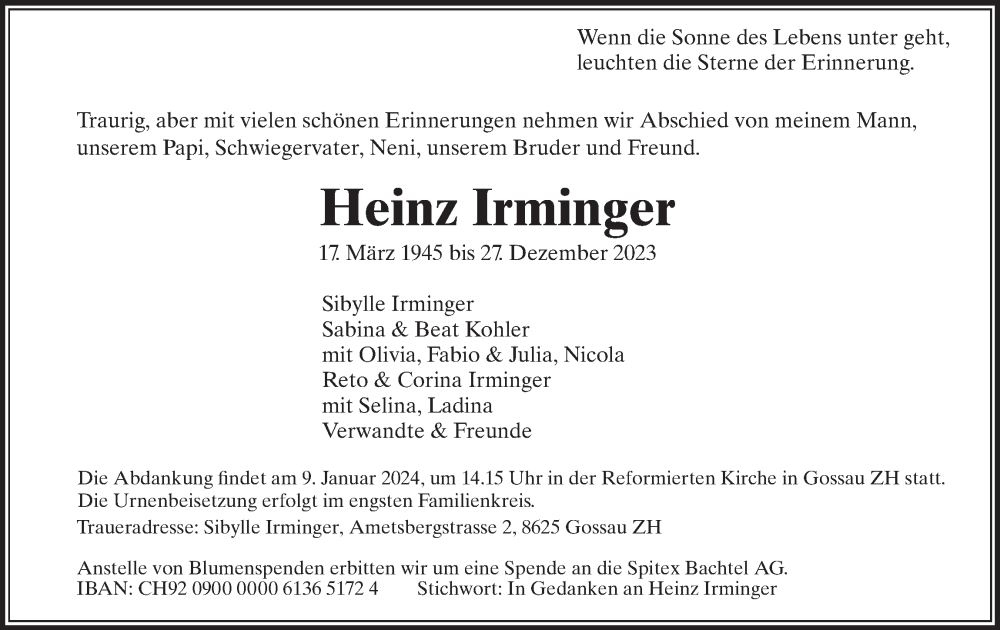 Hier finden Sie alle Traueranzeigen aus der Zeitung, die bisher für Heinz Irminger erschienen sind. Weitere Traueranzeigen, die in der Zeitung erscheinen, werden hier ebenfalls aufgelistet