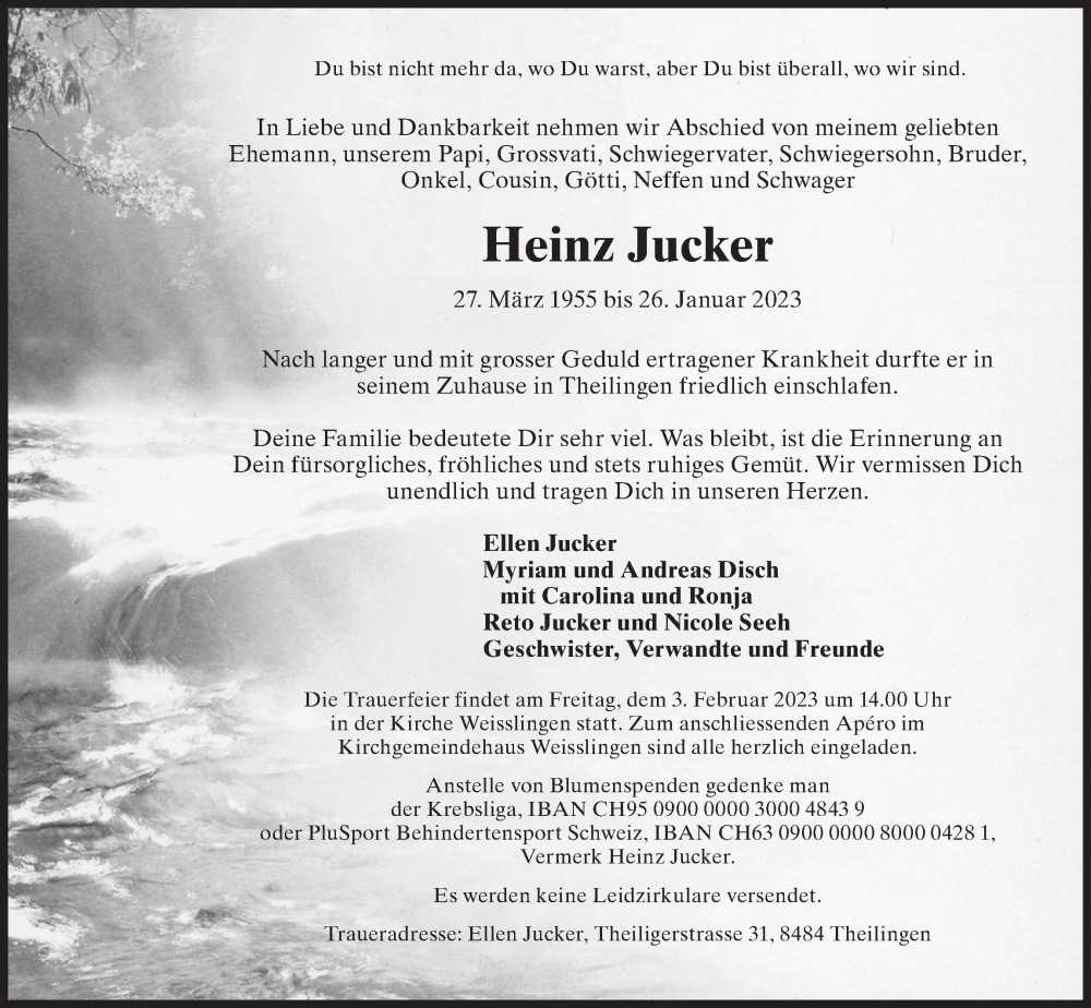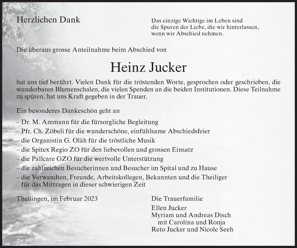 Hier finden Sie alle Traueranzeigen aus der Zeitung, die bisher für Heinz Jucker erschienen sind. Weitere Traueranzeigen, die in der Zeitung erscheinen, werden hier ebenfalls aufgelistet