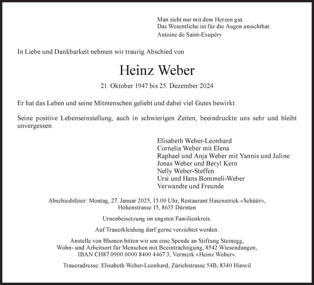 Hier finden Sie alle Traueranzeigen aus der Zeitung, die bisher für Heinz Weber erschienen sind. Weitere Traueranzeigen, die in der Zeitung erscheinen, werden hier ebenfalls aufgelistet