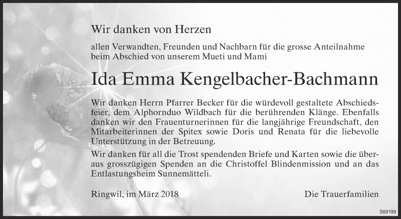 Hier finden Sie alle Traueranzeigen aus der Zeitung, die bisher für Ida Emma Kengelbacher-Bachmann erschienen sind. Weitere Traueranzeigen, die in der Zeitung erscheinen, werden hier ebenfalls aufgelistet