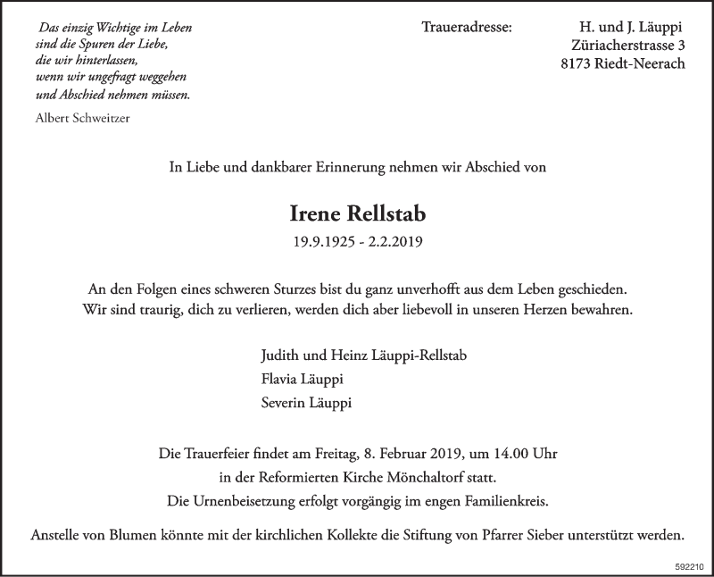Hier finden Sie alle Traueranzeigen aus der Zeitung, die bisher für Irene Rellstab erschienen sind. Weitere Traueranzeigen, die in der Zeitung erscheinen, werden hier ebenfalls aufgelistet