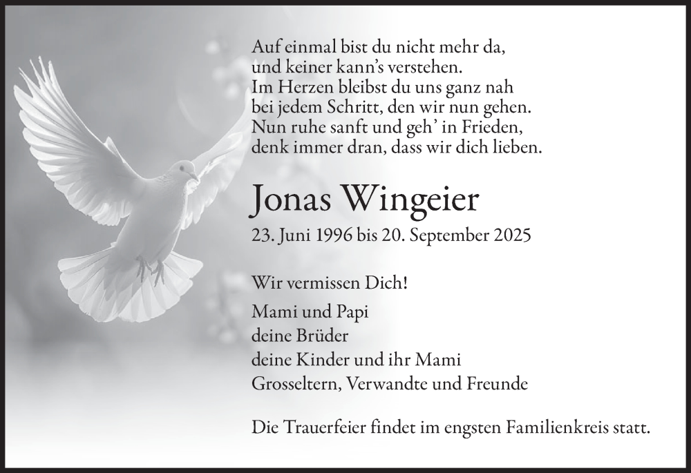 Hier finden Sie alle Traueranzeigen aus der Zeitung, die bisher für Jonas Wingeier erschienen sind. Weitere Traueranzeigen, die in der Zeitung erscheinen, werden hier ebenfalls aufgelistet