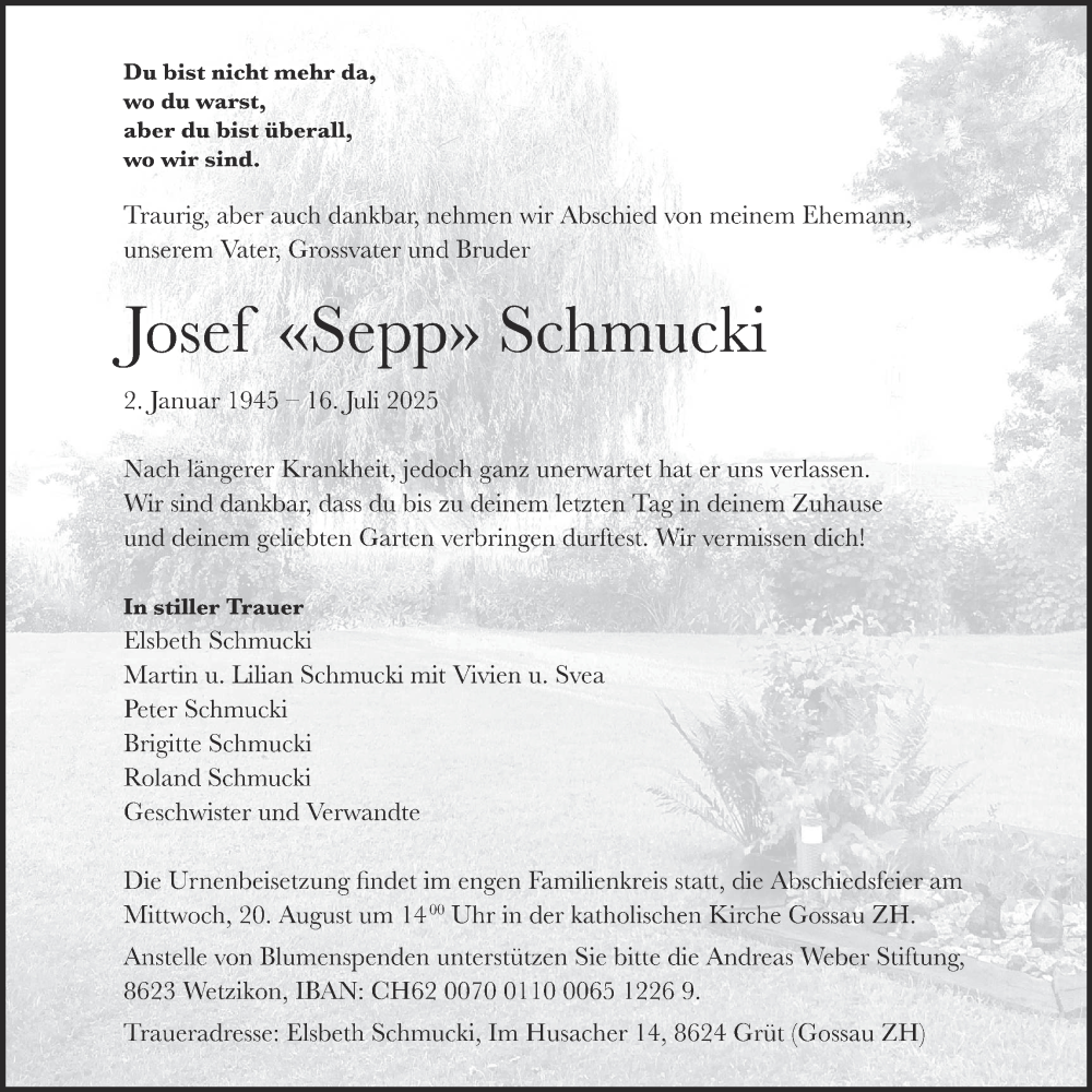 Hier finden Sie alle Traueranzeigen aus der Zeitung, die bisher für Josef Schmucki erschienen sind. Weitere Traueranzeigen, die in der Zeitung erscheinen, werden hier ebenfalls aufgelistet
