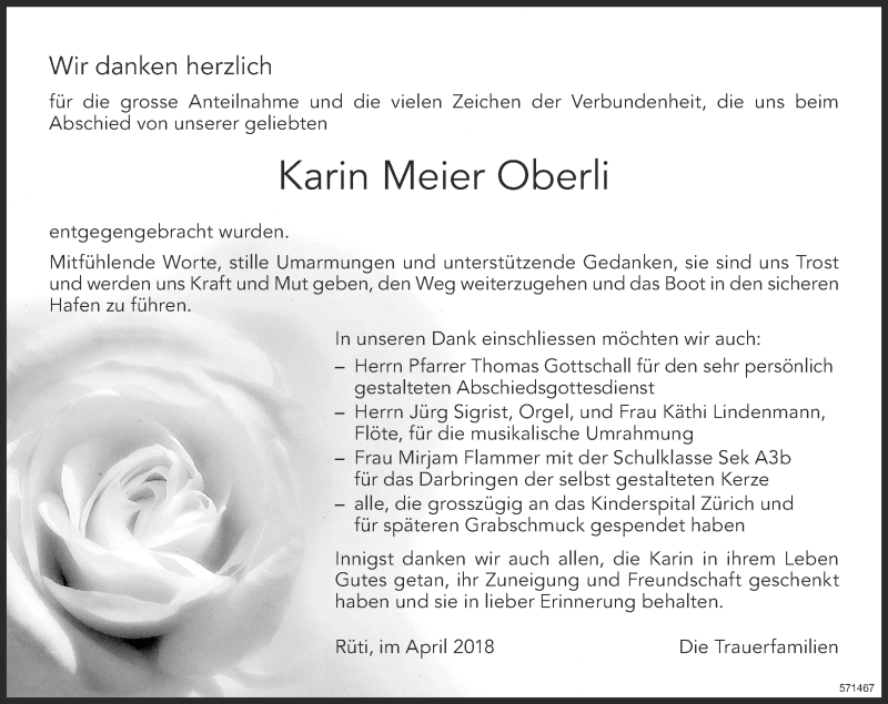 Hier finden Sie alle Traueranzeigen aus der Zeitung, die bisher für Karin Meier Oberli erschienen sind. Weitere Traueranzeigen, die in der Zeitung erscheinen, werden hier ebenfalls aufgelistet