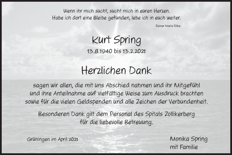 Hier finden Sie alle Traueranzeigen aus der Zeitung, die bisher für Kurt Spring erschienen sind. Weitere Traueranzeigen, die in der Zeitung erscheinen, werden hier ebenfalls aufgelistet